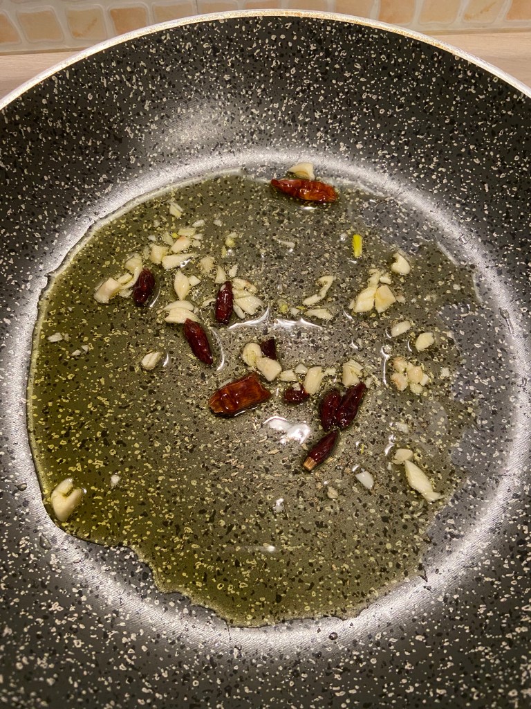 Scaldiamo una padella, mantenendo la fiamma bassa per tutto il periodo, e aggiungiamo prima l’olio ( 4 cucchiai ) e poi l’aglio. Facciamo soffriggere qualche minuto e uniamo il peperoncino ( nel caso non avete a disposizione gli spicchi di peperoncino, aggiungere l’olio piccante q.b. ).