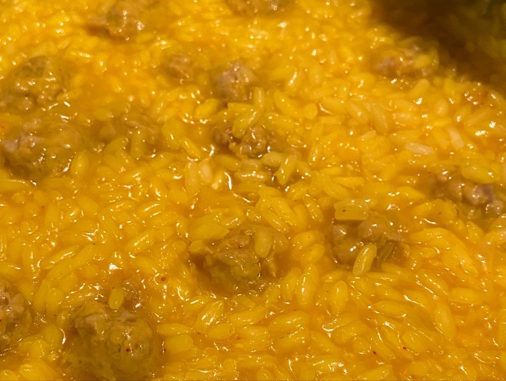 quella che propongo oggi è una ricetta sempre a base di riso carnaroli ma con l’aggiunta di zafferano e salsiccia.