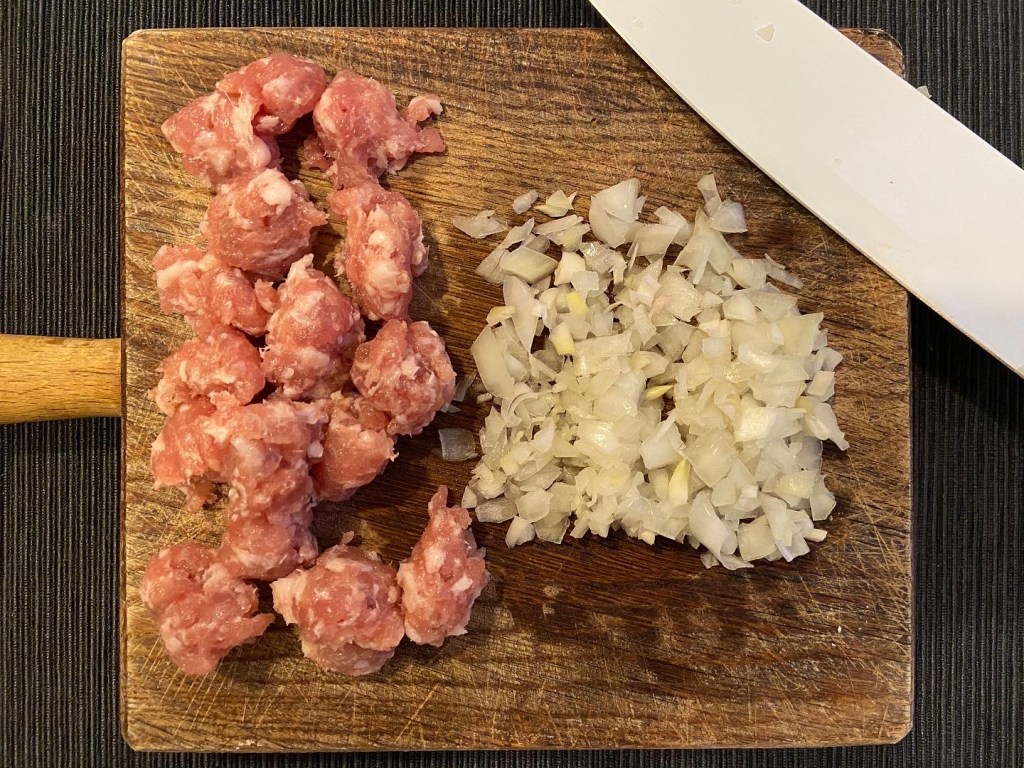 Tritata la cipolla, andiamo a preparare i rotolini di salsiccia, io ne considero una decina per persona.