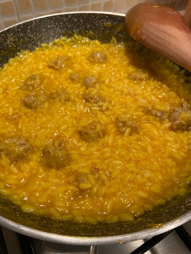 Potremmo dire che partiamo da un classico della cucina milanese, il risotto alla milanese ma poi lo andiamo a variare inserendo la salsiccia come ingrediente aggiuntivo.